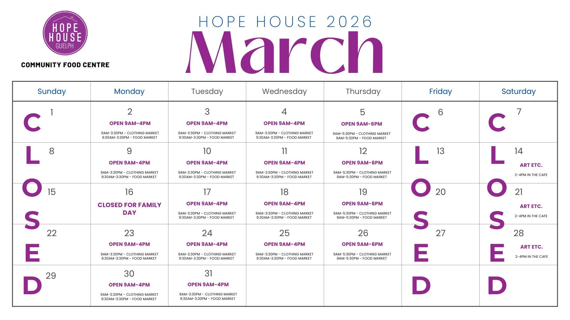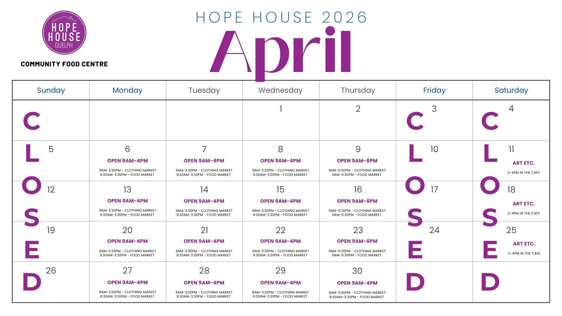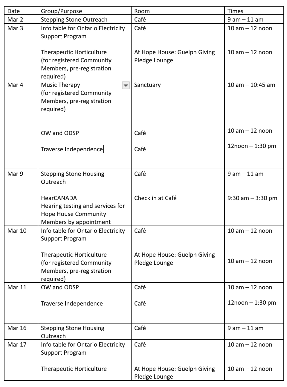 If you are a resident of Guelph looking to access Hope House services and programs we can complete an intake to register you as a Hope House Community Member. We will introduce you to our programs and can discuss other services in the community.Please come at least an hour before we close to allow enough time for the intake process and your first shop in our food market. Bring along a piece of ID for yourself and each member of your household as well as reusable bags to carry your groceries.Email Hope House with any questions.Hope House Schedule